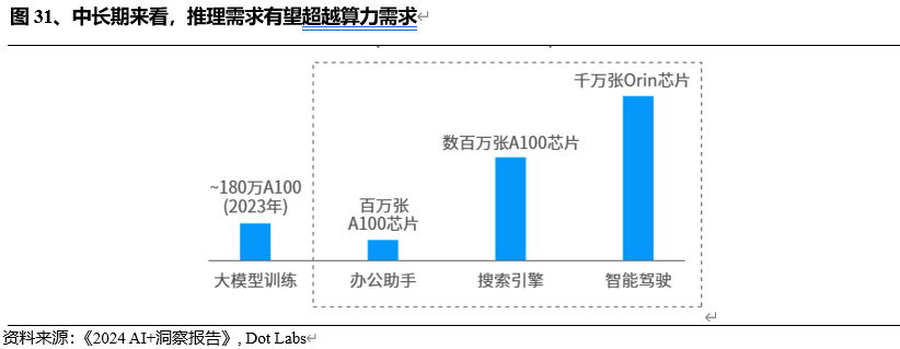 但是随着大模型的实际应用场景愈发丰富,推理需求甚至有望超过训练需求。中长期来看,推理将接力训练,成为算力投资增长的主要贡献。当前的算力需求仍以大模型训练为主,未来伴随应用的不断落地,推理需求逐步释放,中长期将成为算力需求的主力。区别于训练侧,推理侧的算力需求无法重复使用,而是跟随应用场景、用户数量、使用频次的增长而扩展。