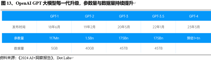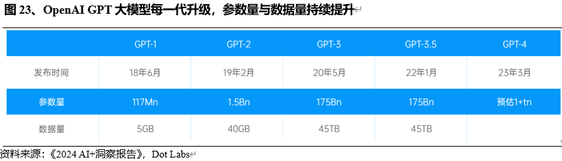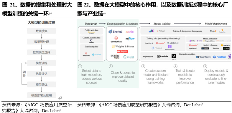 模型能力较大程度上依靠训练数据,且对数据的需求量正在不断膨胀。用GPT来举例,GPT更新迭代所需的数据量正在呈指数级别上升。因此,数据的数量、质量以及处理数据的方式将成为大模型产业竞争的重点环节。