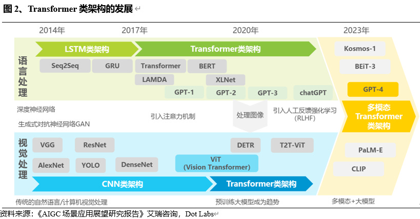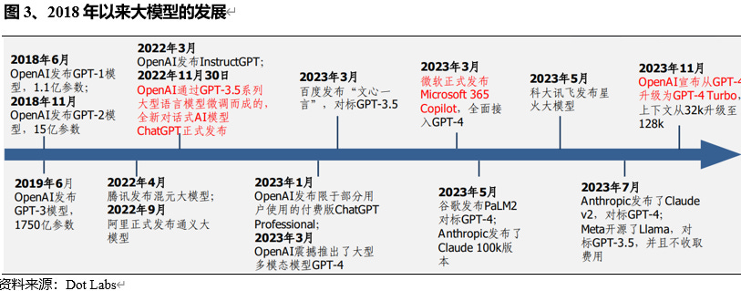 有了transformer架构的支撑,大模型的革命随之到来。从最初的 Transformer 论文到2017 年谷歌推行 transformer 模型,继而 2018 年第一代 GPT 现身,Transformer模型基于其对文本处理和并行计算的突出优势极大地推动了大语言模型的发展。