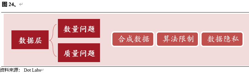 在数据层面的发展方面可能会遇到一些潜在的问题。让我们还以皮肤科医生大模型为例。首先如果我们希望训练出的大模型足够准确,就需要为其提供足够多的数据,那就需要足够的患者样本。但是如果大模型已经穷尽了可以找到的所有患者样本,没有新的数据提供训练之后,大模型又应该如何进行自我迭代呢?这就是数据层可能面临的第一个问题:日益增长的数据需求与受限的数据供给。其次,我问给皮肤科医生大模型提供的患者图像最好是清晰的,分辨率高的。模糊的的图像、低质量的数据会对大模型的严重影响模型的学习能力。紧接着,当前网络上充斥着由大模型生成的虚拟数据,如果使用这些数据来对皮肤科大模型训练,将导致生成的模型出现不可逆转的缺陷。同时,在使用不同算法任务对大模型进行训练时,不同的算法有着不同的数据处理难点。数据的收集和使用可能会出现隐私与安全方面的问题。如何有效地应对、解决这些问题既是数据层面临的挑战,也是下一个时期发展的重点。