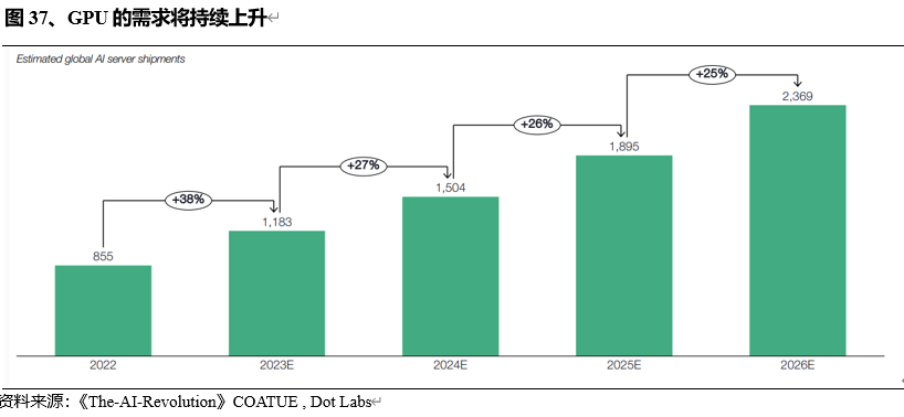 由于大模型训练导致全球算力需求激增,GPU的需求量也将迎来爆发。根据COATUE的估计,全球市场对GPU的需求将以25%的速度逐年攀升。