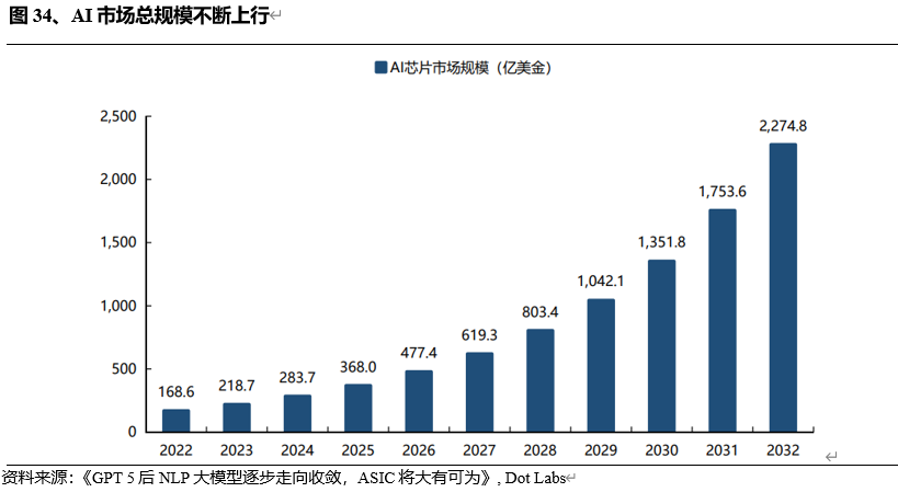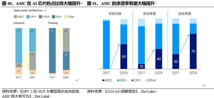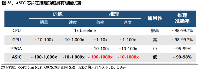 伴随推理侧需求释放,ASIC方案有望加速渗透。在早期大模型快速迭代的训练端爆发阶段,算力及互联带宽为核心指标,同时使用通用芯片可避免专门研发定制芯片所带来的高投入和高风险,故高算力通用GPU为此阶段硬件端最优解。随着大规模应用部署的推理端放量阶段到来,偏应用定制化且具备成本、功耗、体积等优势的ASIC方案渗透率有望快速提升。