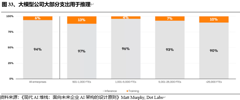 Menlo Ventures最近的企业AI调查表明,几乎95%的AI支出都用于运行时和预训练。即使是像 Writer 这样复杂的 AI 构建者,也将超过 80% 的计算时间用于推理,而不是训练。