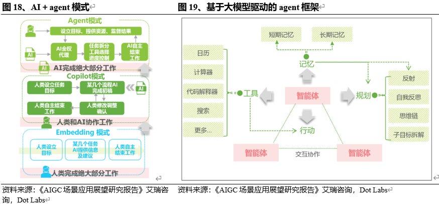 AI Agent相对语言大模型最大的改进是增加自主行动能力,在实现目标过程中无需人类干预。Agent+大模型将有望构建具备自主思考、决策和执行能力的智能体,进一步提升大模型的应用能力。在人工智能领域,AI Agent视为能够使用传感器感知周围环境、做出决策并使用执行器做出响应的人工实体。对比AI与人类的交互模式,AI Agent 较目前广泛使用的Copilot模式更加的独立,能够自主调用资源完成任务,人类在其中起到督促和评估的作用。AI Agent具有更广泛的应用范围可处理多个任务,并在不同领域中执行各种功能;具有更自然和灵活的交互方式,能够理解复杂的自然语言指令,与用户进行更智能对话。