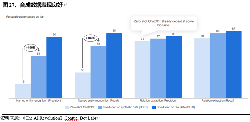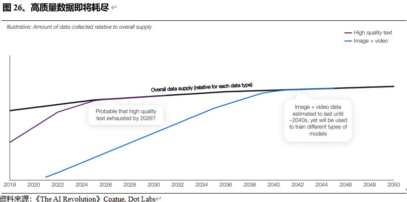 对数据进行扩充等处理来形成新的数据。首先,我们我们可以将数据进行扩充。数据扩增就像是给数据改头换面,从老一套中创造出新的面貌。比如,原来我们给皮肤科医生大模型输入了患者A和患者B的图片数据。下一次,我们把这两张图片做出一些小改动,比如旋转了A患者的照片,放大了另一张照片,或者改变了B患者照片的光线。这样,虽然我们没有拍摄任何新的照片,但是就模型而言增加了数据集。其次,大模型在进行推理步骤时也能够产生数据。比如用户在使用皮肤科医生这个大模型时给大模型的反馈也会生成新的数据点,形成训练大模型数据集的一部分。这种方法非常适合收集数据,因为它会不断产生新的场景和挑战,帮助大模型从广泛的经验中学习。这一过程可以在多台机器上并行执行。由于推理的计算成本很低(与训练相比),这一过程对硬件的要求也很低。最后一个存在争议的办法是合成数据。合成数据是指通过算法、生成模型甚至是模拟生成的人工数据,而不是由人类直接创建的,其特征和模式模仿真实世界数据。合成数据通过允许研究人员以低成本的方式生成大规模、多样化和可控的训练数据集,是数据枯竭的一个强有力的解决方案。