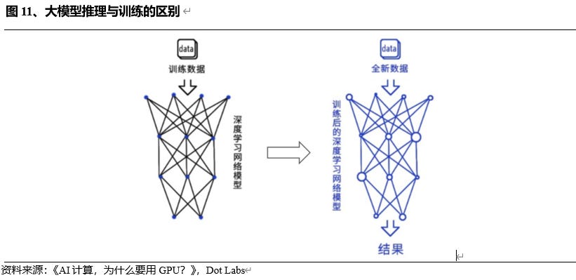 推理是指利用训练好的神经网络模型进行运算,利用输入的新数据来一次性获得正确结论的过程。当我使用ChatGPT并得到回应时,模型正在执行推理。我们就可以使用这个训练好的大模型完成特定任务发过程就是推理。推理本质上是利用输入的新数据“一次性”获得正确结论的过程,他不需要和训练一样需要循环往复的调整参数,因此对算力的需求也会低很多。训练大模型可能要花费数千万美元,但进行一次推理只需几分之一。