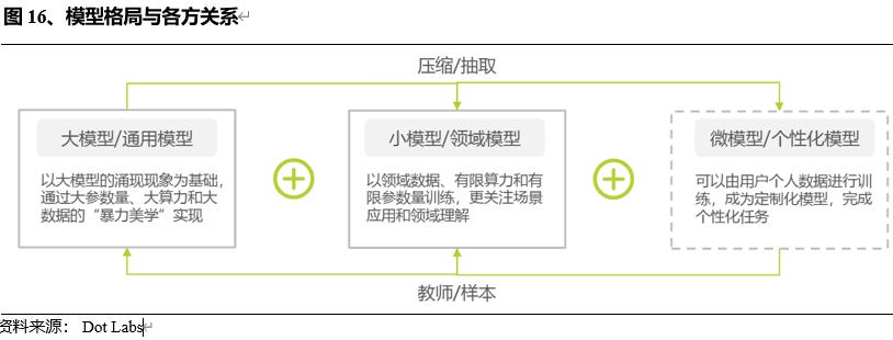 短周期内通用类大模型市场热度较高,长周期内多种模型组合是未来发展方向。根据模型体量,模型可分为大模型、小模型、微模型。大模型参数量大,算力强,具备通用类问题处理能力。小模型多专注于垂类领域,往往在垂直场景具备充足的数据以及问题处理能力。微模型更加个性化,由用户个人数据训练而成。大模型和小模型具备不同的优势,分别通过压缩技术以及教师模型进行整合来提高问题处理能力,能够实现1+1大于2的效果,可能是未来模型层的发展方向。