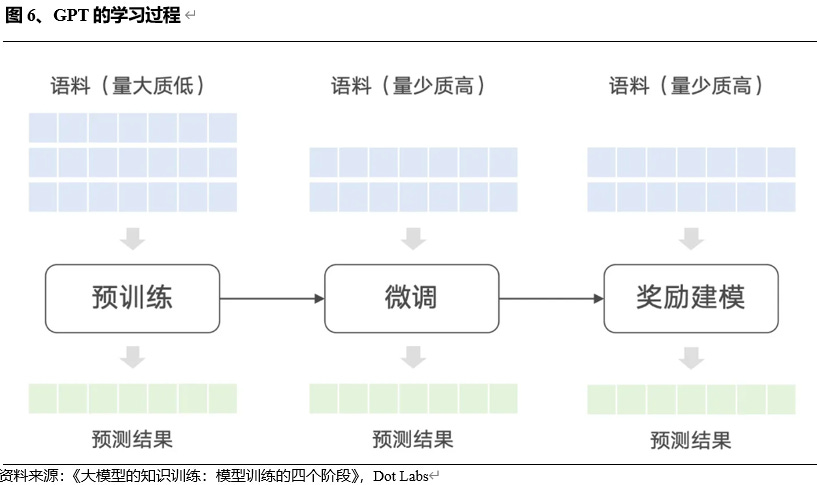 算法是用来定义整个大模型训练过程的。选定了一个算法之后,大模型就能够通过该算法来对数据进行处理训练。事实上,为了提高大模型的准确性,上述集中机器学习的算法常常是一起出现的。比如GPT的训练就将以上几种算法融合在一起。在《State of GPT》这份报告中,大模型的训练包括以下四个阶段,预训练阶段(Pretraining)、有监督微调阶段(Supervised Finetuning)、奖励建模阶段(Reward Modeling)、强化学习阶段(Reinforcement Learing)。其中,预训练阶段采用无监督学习算法将大量的数据输入大模型中进行自主分组,进入监督微调阶段后,通过监督学习算法用少量人为攥写的语料做微调,给数据标上标签。奖励建模阶段和强化学习阶段采用强化学习算法,基于有监督微调模型,对同一提示多次调用模型产生不同的输出,请人来对不同的输出进行评分。基于评分数据,训练出奖励模型。通过不断地试错、评分与强化最终形成了震惊世界的GPT。