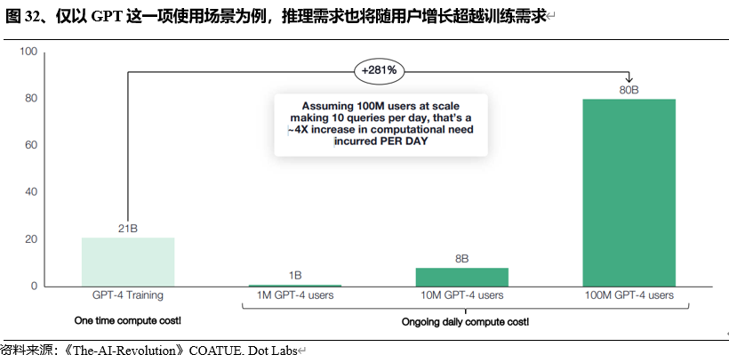 仅以GPT这一项使用场景为例,持续的推理可能需要比一次性训练更多的计算。假设 100M 用户每天进行 10 次查询,则每天产生的计算需求增加了4倍。