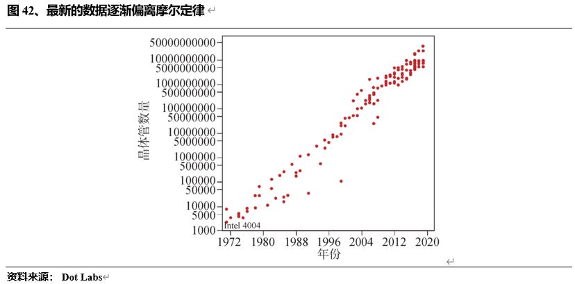 2000年之前,每一代芯片的性能提升来自两个方面:一是按照Denard(登纳德)微缩效应,每代芯片的频率提升带来了40%的改进;二是每代芯片晶体管密度提升带来的体系结构的改进符合波拉克法则,即平方根级别的提升,达41%。将这两方面的性能提升叠加,最终得到1.97倍,于是每代会有差不多一倍的提升,而且,芯片晶体管密度的“摩尔定律”可换算成性能的“摩尔定律”。