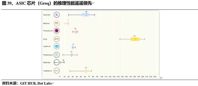 我们来看当下较为领先的“推理 ASIC”亦或是“LLM 专用 ASIC”Groq,Groq 由谷歌TPU 团队成员创立,在经过了几年的默默发展后,最终在2024 年 2 月一鸣惊人,运行在Groq 平台上的Meta Llama 2 模型,实现了领先的推理速度,将大模型的推理速度带到了500 Token/s,而GPT-4 的输出速度则在40 Token/s,是顶级云计算供应商的18倍。 Groq在延时(Latency)这个用户核心痛点上提供了卓越的解决方案。Groq LPU搭配Meta Llama 2 70B能在7分钟内就能生成与莎士比亚《哈姆雷特》相同数量的单词,比普通人的打字速度快75倍。